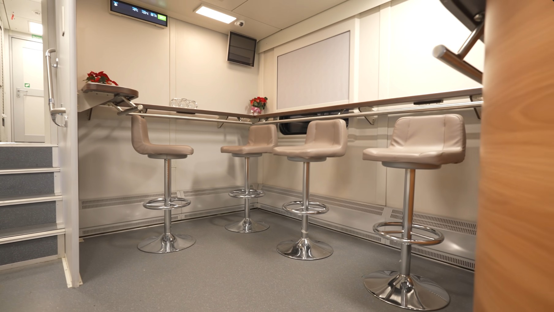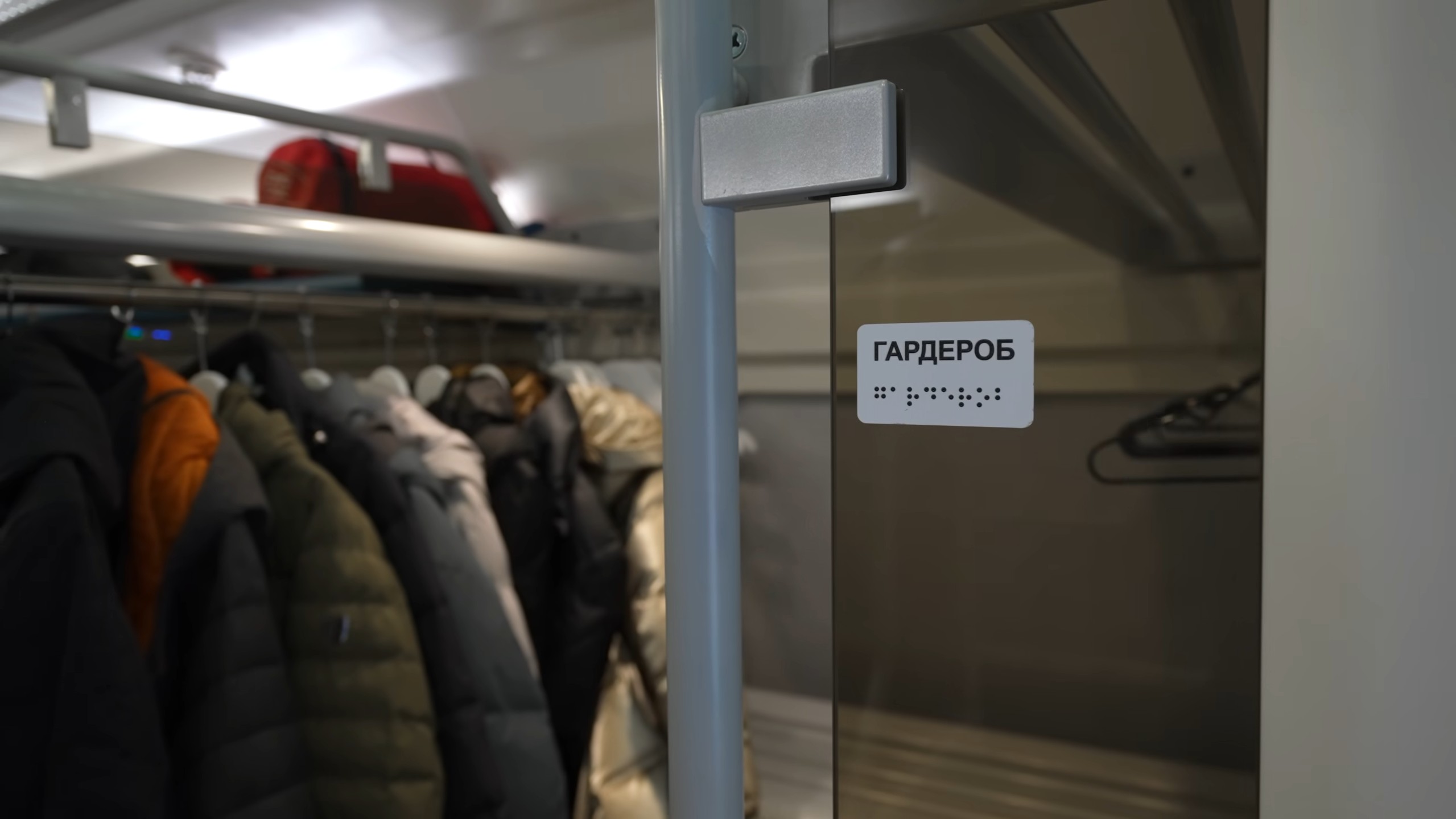 Бар-ресторан с высокими стульями и окном над путями напоминает уютное кафе, где можно просто смотреть, как сменяются города. А рядом — гардероб с аккуратными плечиками, полки для чемоданов, зона для колясок. В некотором смысле, все это превращает скоростной поезд Аврора в маленький движущийся дом.