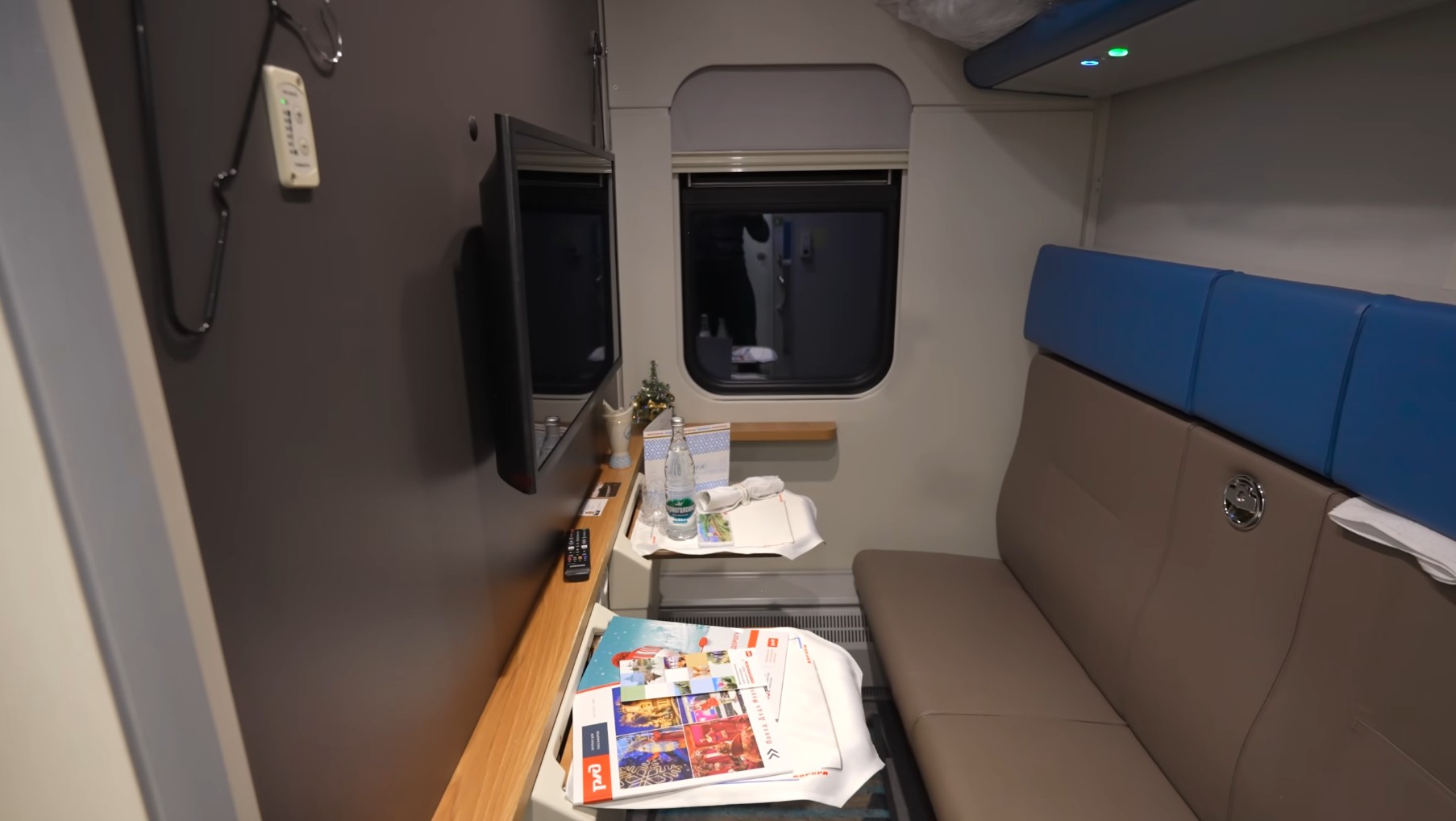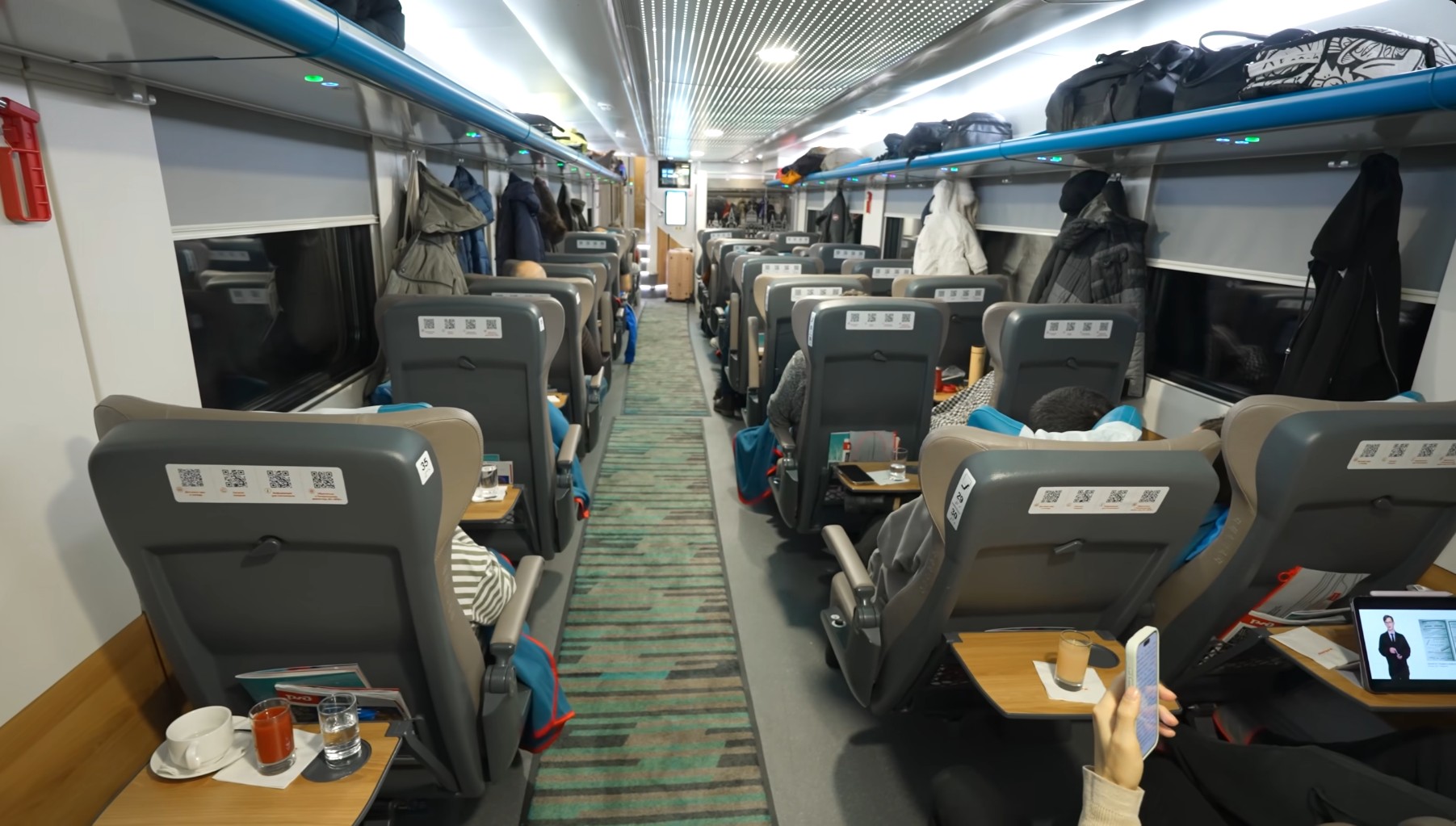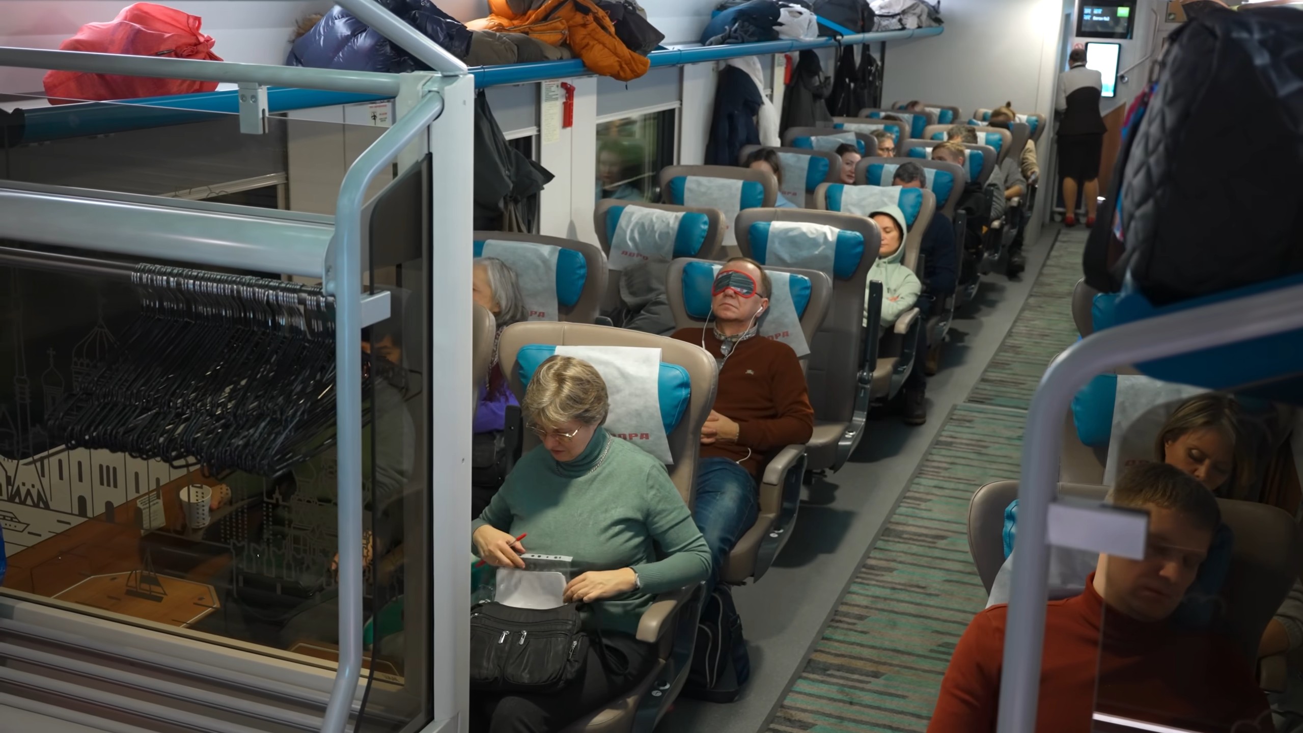 Внизу — сидячие места бизнес-класса, где кресла можно слегка откинуть назад, а откидной столик превращает обычный путь в рабочую зону. Между прочим, на форуме уже писали отзыв, что в поезде 744У даже при полной загрузке не чувствуешь тесноты. Есть и купе СВ — небольшие, но очень продуманные: экран, полка, мини-салон с диваном и зоной отдыха. В новом плане 2026 года такие места займут отдельный класс обслуживания.